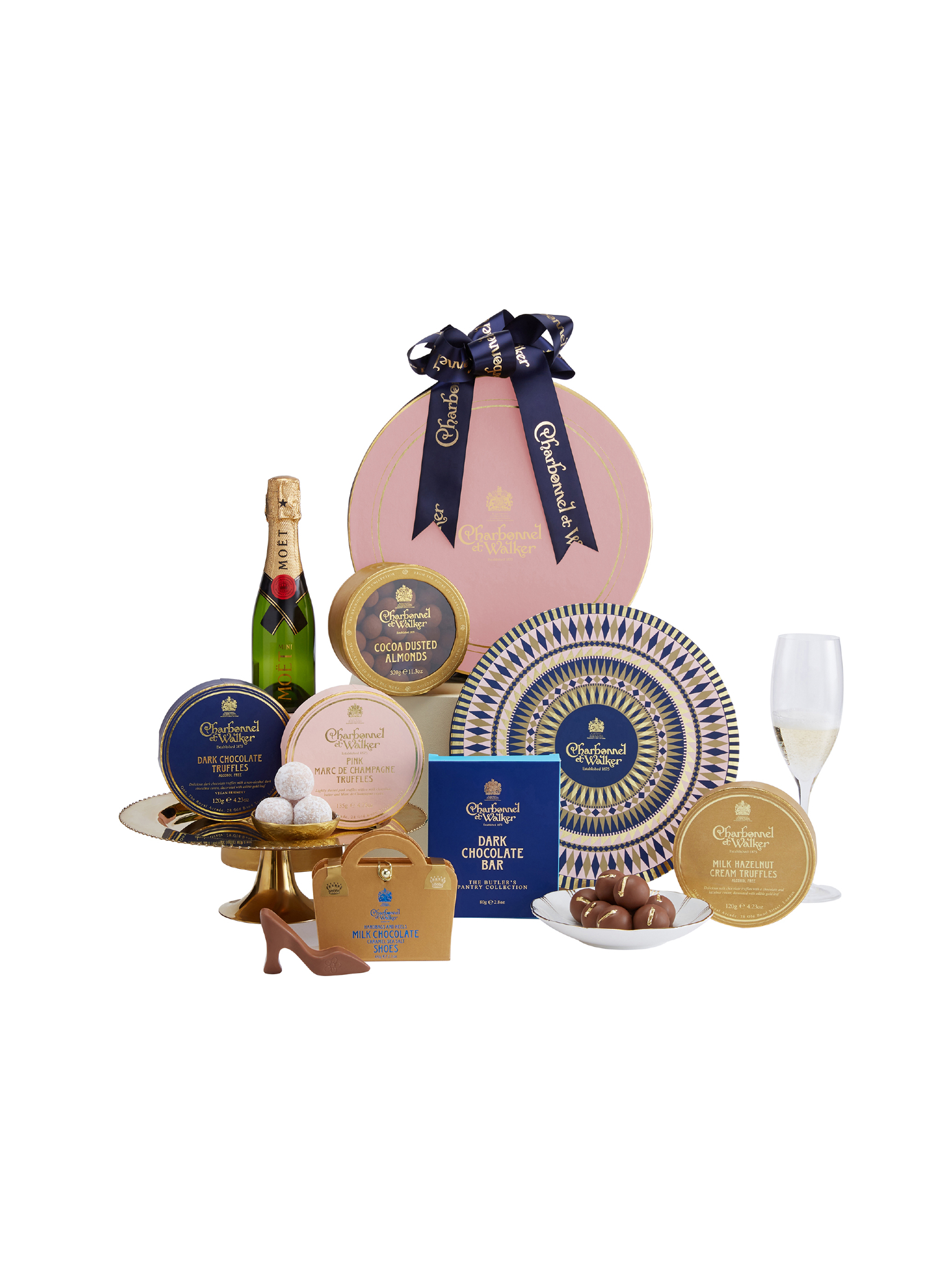 A magnificent hamper to gift or receive, the splendid pink box is filled with a delicious selection of classic Charbonnel et Walker chocolates and truffles, all complemented with a mini bottle of Moët et Chandon Champagne.