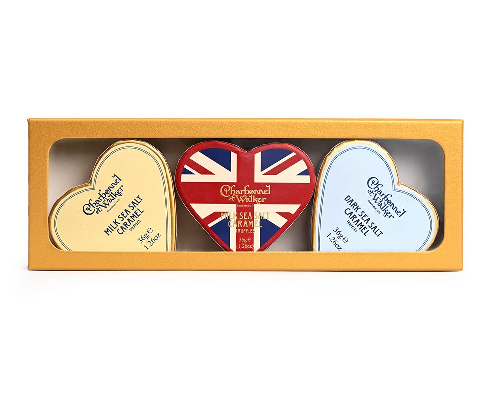 Three delightful Mini Hearts are scrumptiously filled with with our delectable Sea Salt Caramel Truffles. With Milk Sea Salt Caramel in an elegant cream and navy heart, Dark Sea Salt Caramel in pretty pastel blue and a further Milk Sea Salt Caramel Mini Heart in striking Union Jack flourish. A truly lovely present housed in an elegant gold gift box.