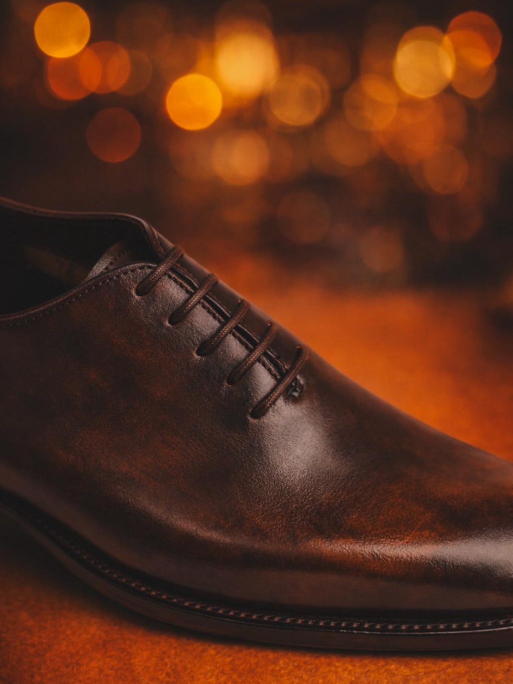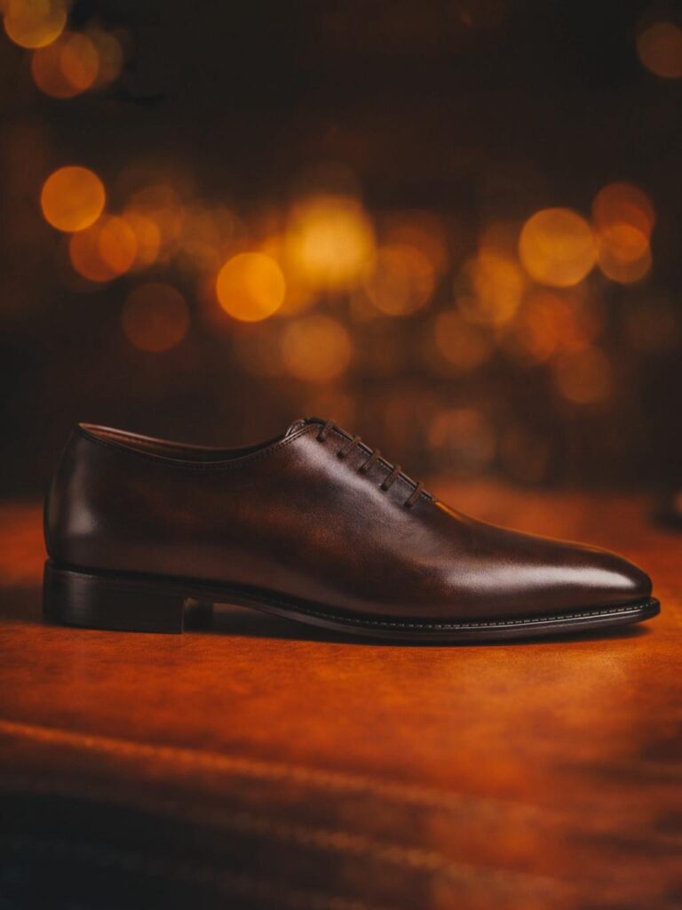 One of Cleverley’s most elegant styles, the Merlin is a whole-cut Oxford crafted from a single piece of dark brown burnished calf. The seamless construction creates a refined silhouette, while smooth hide linings and hand-welted soles ensure both comfort and durability.