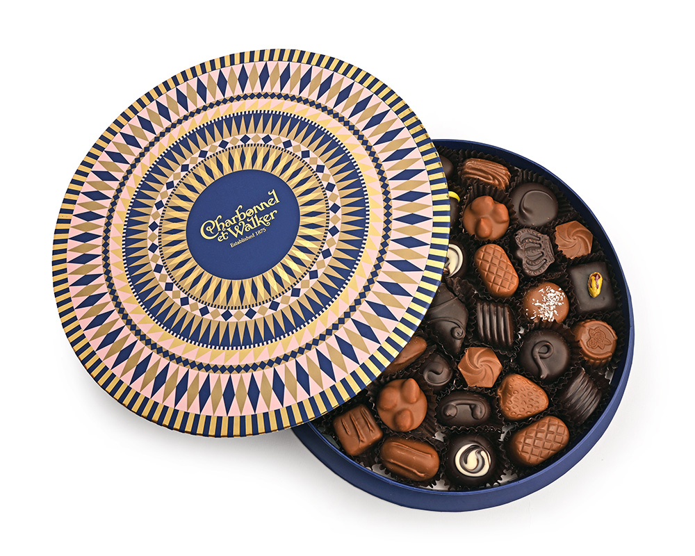 A beautifully elegant gift box with Victorian inspired geometric design and cascading colours of pink, navy, and gold. Filled to perfection, the lid opens to an impressive array of our most iconic and classic Fine Milk and Dark Chocolates. With Rose and Violet Creams, Caramel Noix, Romano, Falstaff, Butter Fourre, Milk and Dark Chocolate Crowns, Orange Cream, Vanille Creme, Fraise, Truffle Cafe, and many, many more.