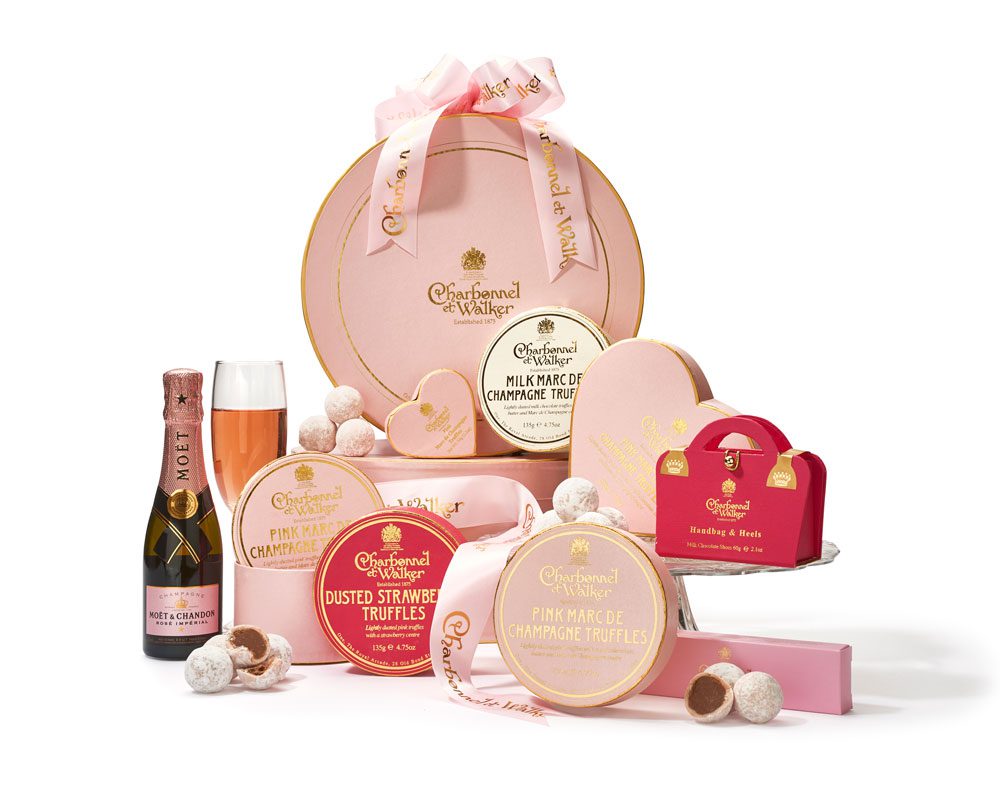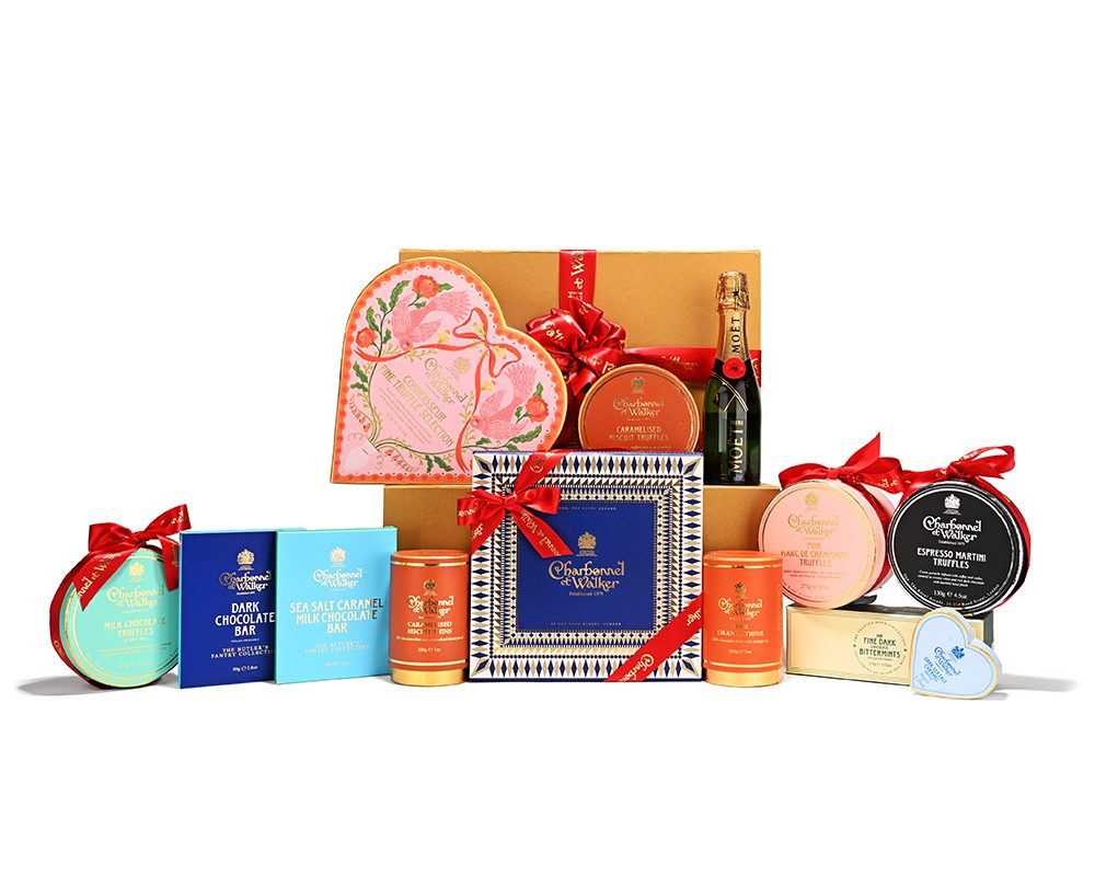 This decadent hamper is filled with a superb selection of decadent chocolates and truffles in the prettiest of gift boxes. One for warming hearts and making everlasting impressions. Indulge in iconic Pink Marc de Champagne Truffles, after dinner with Espresso Martini, afternoon tea with Dark Chocolate Bittermints, a beautifully illustrated pink heart filled with a fine truffle selection, Caramelised Biscuit truffles when something soothingly sweet is required, a Victoriana square chocolate box, filled with a fine Milk and Dark Chocolate Selection and there is more to delight in and choose from, all the while, sipping on a glass of Moet Champagne for a little extra fizz.